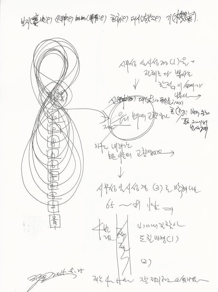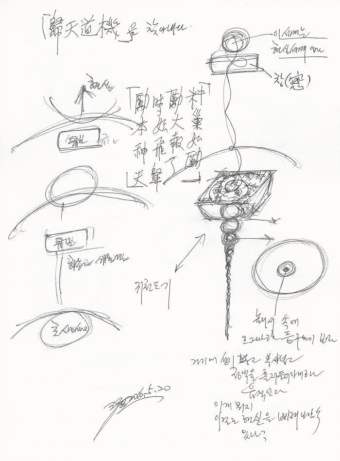 그리고 나도 보기 위해서 써서 걸어놓으려고 도칠마경 (1), (2)를 쓰고 역(易) 여시(如始) 대류도(大流道)를 아래에 써놓았다. 써놓고 보는데 그 판에서 누름 장치 같은 것이 보였다. 누름 장치 같은 것을 누르니 윙 소리가 난다. 어 이거 뭐지?