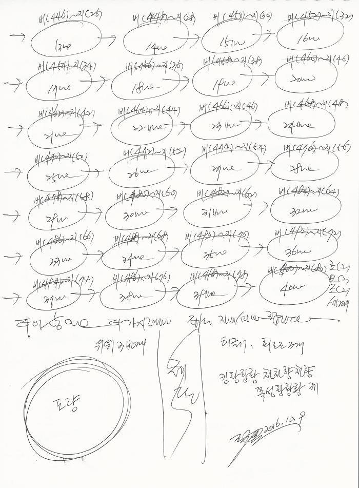| 목차 2016. 10. 01 ~~~보(寶:80)순(純:80)여(如:80)...공(功:20)보(寶:20) 려(勵:20)보(寶:20) 순(純:2)두(頭:2) 세계를 밝히다 2016. 10. 03 ~~~려(勵:80)숭(崇:80) 신(神:80)루(累:80) ...보(寶:80)존(尊:80) 두(杜:2)본(本:2)숭(崇:2) 세계를 밝히다 2016. 10. 04 ~~~ 조(造:140)료(料:140)순(純:140) ...영(靈:100)창(窓:100) 신(神:2)명(明:2) 세계를 밝히다 2016. 10. 05 ~~~영(靈:160)루(累:160) 순(純:160)보(寶:160)신(神:160)...여(如:60)환(還:60) 숭(崇:2)료(料:2)보(報:2) 세계를 밝히다 2016. 10. 05 ~~~려(勵:60)보(寶:60)순(純:60) 신(神:60)공(功:60)...명(明:60)종(宗:60) 두(杜:2)여(如:2) 명(明:2)본(本:2) 세계를 밝히다 2016. 10. 06 ~~~영(靈:172)도(道:172) 려(勵:172)시(始:172)...본(本:72)려(勵:72) 여(如:72)종(宗:72) 세계를 밝히다 2016. 10. 06 ~~~종(宗:104)두(頭:104)소(巢:104)...료(料:46)동(動:46)여(如:46) 루(累:44)지(智:44) 세계를 밝히다 2016. 10. 06 ~~~위 8번째 제단 앞까지 밝히다 2016. 10. 06 기억에 없는 모든 자식들을 의념 의식해 올라온 세계까지 올라오도록 하다. 나와 같이 할 수 있는 이들은 기억에 없는 모든 생에 자식들과 몸 받아 태어나지도 못했지만 자식으로 태어나려고 했던 모든 자식들을 의념 의식해 구하여 줄 수 있는 한 구해주었으면 싶어서 이와 같은 글을 쓰다 2016. 10. 06 봉삼을 모셔오다 2016. 10. 07 ~~~요(了:120)보(寶:120)려(勵:120...숭(崇:120)료(料:120) 보(寶:2)영(靈:2)창(窓:2) 세계를 밝히다 2016. 10. 07 우리 다함께 사이좋게 가자라는 수인 외 7개를 밝히다 2016. 10. 08 ~~~두(頭:16)본(本:16)두(斗:16)...두(斗:16)본(本:16)여(如:16) 영(靈:16)본(本:16)지(地;16) 세계를 밝히다 2016. 10. 08 ~~~두(頭:160)본(本:160)두(斗:160)...두(斗:20)태(太:20)황(凰:20) 보(寶:20)명(命:20) 세계를 밝히다 2016. 10. 08 ~~~ 위 9번째 제단....초(初:40)보(寶:40)영(靈:40) ...본(本:40)황(凰:40) 혼(魂:2)숭(崇:2) 세계를 밝히다 2016. 10. 08 우리들의 본향 고향으로 돌아가자라는 수인 외 2개를 밝히다 2016. 10. 09 성성적적향향 촉성향 쪽쪽성 수인 외 9개를 밝히다 *성성적적향향 축성향 쪽쪽성성향향 축성향향 환환청청환청향 수인 : 이 수인을 하게 되면 온몸에 기혈이 막힌 곳 없이 막힌 곳 뚫으면서 엄청나게 빨리빨리 돌아가게 됩니다. 1분에 200번 이상 돌아가게 됩니다. 2016. 10. 10 ~~~초(初:164)보(寶:164)영(靈:164) ...료(料:26)묘(妙:26)보(寶:26) 도(道:24)신(神:24) 묘(妙:24)지(智:24) 세계를 밝히다 2016. 10. 10 ~~~초(初:240)보(寶:240)영(靈:240) ..도(道:100)신(神:100) 묘(妙:100)지(智:100) 태(太:2)영(靈:2) 태(太:2)혼(魂:2) 세계를 밝히다 2016. 10. 11 성려문(性勵門)과 가상 성려문(性勵門) 통로. 각기 저마다의 몸은 위 세계로 올라가는 길이고 통로이다. * 성려문(性勵門) 통로 : 성기를 통해 위로 따라 올라오는 이들이 위로 올라가는 통로 * 가상 성려문(性勵門) : 56단계에서 자등명 세계로 직선으로 올라오지 못하고 반야바라밀행길이 옆으로 나 있는 것과 같이 성기를 통해 따라 올라오는 이들을 성기 밑에서 머리 위쪽으로 길을 만들어 놓고 몸통을 통하지 않고 머리 위로 올라가도록 길을 만들어 놓은 것. 2016. 10. 11 수인 3을 밝히다. 가자가자 어서가자 어서 빨리 저 위 세계로 가자 수인 / 모두 다 위 세계로 가자 란 가자가자 어서가자 어서 빨리 저 위 세계로 가라 수인 / 나에게는 아무 것도 없으니 이제 그만 저 위 세계로 가거라라는 수인공 2016. 10. 11 ~~~주(主:88)혼(魂:88) 태(太:88)황(凰:88)...보(寶:88)홍(弘:88)초(初:88) 세계를 밝히다 2016. 10. 11 ~~~주(主:198)혼(魂:198) 태(太:198)황(凰:198)...려(勵:2)신(神:2) 세계.....위 10번째 제단에서 제를 지내다 2016. 10. 11 가자가자 어서가자 어서 빨리 저 위 세계로 가자 수인 외 2개를 말하다 2016. 10. 12 ~~~보(寶:144)명(命:144) .. 비(飛:106)여(如:106) 본(本:104)시(始:104)요(了:104) 세계를 밝히다 2016. 10. 12 ~~~ 우(優:20)신(神:20)황(凰:20)...태(太:2)보(寶:2)구(救:2) 명(明:2)주(主:2) 세계....위 11번째 제단에서, 위 12번째 제단에서 제를 지내다 2016. 10. 12 ~~~우(優:80)신(神:80)황(凰:80)...명(命:60)요(了:60) 운(運:2)존(尊:2)주(主:2) 세계...위 13번째 제단에서 제를 지내다 2016. 10. 13 ~~~봉(奉:280)순(巡:280)려(勵:280) 시(始:280)본(本:280) ...주(主:140)여(如:140)시(是:140) 운(運:2)술(術:2)지(智:2) 세계를 밝히다 *위 14번째 제단 2016. 10. 14 ~~~ 위 15번째 제단 ....명(明:8)본(本:8)려(勵:8) ...비(飛:8)도(道:8)영(靈:8) 시(是:8)두(斗:8) 세계를 밝히다 2016. 10. 14 ~~~명(明:300)본(本:300)려(勵:300) ..태(太:140)신(神:140) 홍(弘:2)료(料:2)본(本:2) 세계...제 16번째 제단 앞에서 제를 지내다 2016. 10. 15 ~~~시(始:310)수(秀:310)명(明:310)...요(了:110)비(飛:110)명(明:110) 두(斗:10)주(主:10)환(還:10) 세계를 밝히다 2016. 10. 15 ~~~시(始:460)수(秀:460)명(明:460) ... 비(飛:40)요(了:40)비(飛:40)시(始:40) 료(料:2)운(運:2) 세계...위 17번째 제단에서 제를 지내다 2016. 10. 15 가자가자 어서가자 어서 빨리 우리들의 본향 고향으로 돌아가자 수인 외 11개를 말하다 2016. 10. 17 ~~~구(究:200)여(如:200)..료(料:2)두(杜:2)승(承:2)지(智:2) 초(初:2) 세계.... 위 18번째 제단 앞에서 제를 지내다 2016. 10. 17 ~~~두(頭:220)명(命:220)....총(總:20)운(運:20)두(頭:20)순(巡:20) 창(創:2)조(造:2) 세계... 위 19번째 제단 앞에서 제를 지내다 2016. 10. 17 ~~~료(料:264)주(主:264)여(如:264)...송(頌:16)명(命