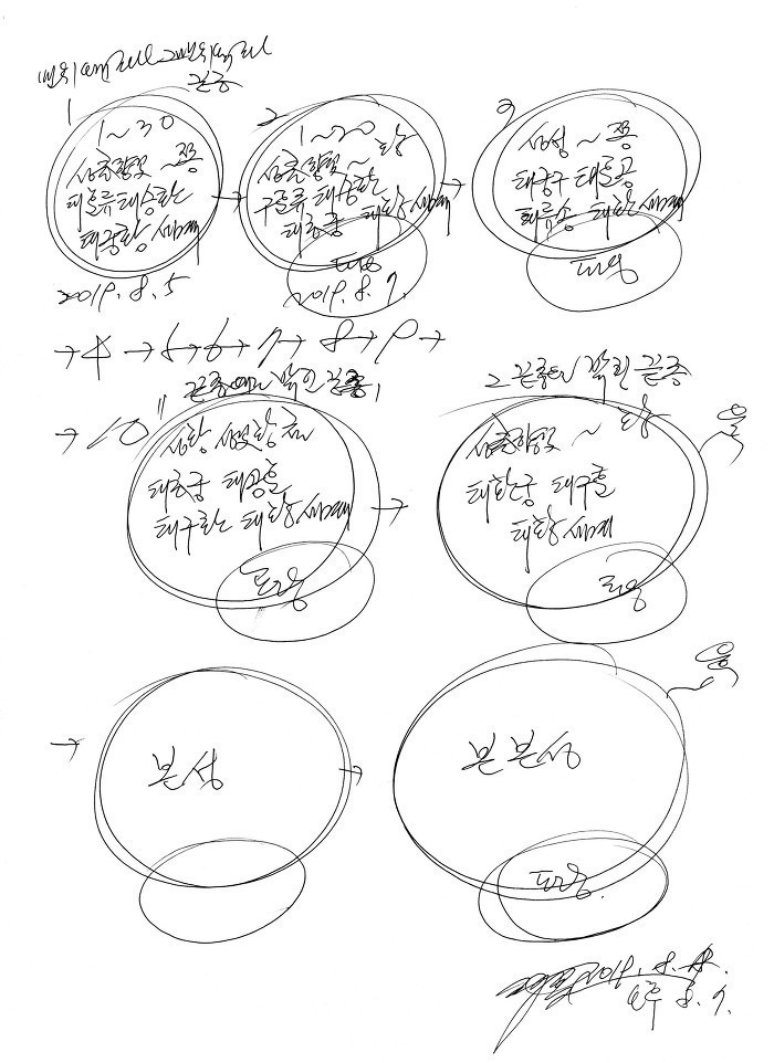 | 1, 맨 위 오직 하나 그 맨 위 오직 하나 끝종 세계 1~~~→80, 맨 위 오직 하나 그 맨 위 오직 하나 끝종 세계 → 이 세계는 꽃향철꽃 성황 성철향출 성성 꽃성쪽황 철황 철꽃황 철, 공(功)태(太)훈(勳) 태(太)초(初)송(頌) 태(太)황(皇)환(還) 태(太)숭(崇) 세계 ~~ 이렇게 해서 3해 3조 3억 7.686. 684번째 맨 위 오직 하나 그 맨 위 오직 하나 끝종 세계 → 이 세계는 철꽃황 철황 철꽃성 쫑킹황출 성성 들철향꽃 성황 성꽃향 출출성꽃 성킹황출 성황 성꽃황 철황 철꽃성 쫑킹황출 성황 성꽃황 철꽃성 쫑, 훈(勳)본(本)환(還) 태(太)황(皇)구(救) 태(太)초(初)류(流) 태(太)궁(窮)송(頌) 세계 이 세계는 요, 우리들의 끝끝 야끝 성황 성철향출 성성 꽃성쪽황 철황 철꽃향 출꽃성 성황 성철향출 성성 꽃황철 황꽃황 철들이 즐비한 세계입니다. 이 세계에서 많은 일들이 벌어지고 있고 많은 일들이 사라지고 있습니다. 그중에 으뜸은 모든 것들을 선사님께서 주관하고 계시다는 사실입니다. 이제 더 이상 없습니다. 더 가시려면 요, 잠시 주무셔야 합니다요. 위 세계로 올라가기 좋게 몸을 만들어 놓도록 하겠습니다. 누우니 양 어깨를 도끼로 찍어 내린다. 그리고는 뼈대만 남겨놓고 모두 다 떼어낸다. 어느 순간 떼어낸 뼈대를 새살이 돋은 듯 두툼하게 뽀얗게 살이 돋아난 듯 보였다. 몸이 이와 같이 바뀐 것인가요? 예. 여기에 하나 더한다면 뽀얀 살갗 속에 위에 맞는 것이 들어있다는 사실입니다. 이제 또다시 올라가셔도 됩니다요, 오늘은 여기서 쉬시고 내일 또다시 밝혀 올라가십시오. |