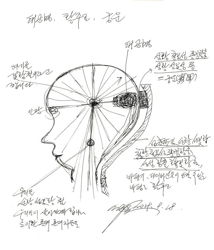 몸통 벽을 모두 다 걷어낸다. 몸이란 껍질을 벗겨낸다. 몸통이란 껍질을 벗겨낸 밝고 환한 몸통이었던 안에서 더 밝고 환한 형상의 모습이 보인다. 처음에는 작게 보였는데 보면 볼수록 점점 더 커져서 배꼽 중심으로 해서 몸통 위쪽으로 점점 커져간다. 몸통 부분을 가득 차도록 커져서는 머리 위로 뻗어 올라간다. 뻗어 올라가는 끝을 따라 올라간다. 그러는 사이 배꼽 아래쪽도 가득 차며 위로 더욱 더 뻗어 올라가는 것처럼 보인다. 위로 올라가는 끝의 부분의 자세하게 살펴보니 용의 머리 같아 보인다. 머리를 보며 몸을 관하여 보니 몸통을 흔들며 머리를 흔들며 위로위로 올라간다. 올라가던 것은 위에 있는 무엇인가? (‘이것은 무엇인가요?’ “마치 난자와 같은 겁니다.” ‘그럼 머리를 흔들고 몸을 흔들며 올라간 것은 마치 정자와도 비슷한 것인가요?’ “예. 그렇게 보셔도 틀리지 않을 겁니다.”)에 부딪쳐 안으로 들어간다. 아침을 먹을 즈음 부딪쳐 들어가기 시작했는데 지금은 그 안으로 내 목까지 들어가 있는 느낌이다.